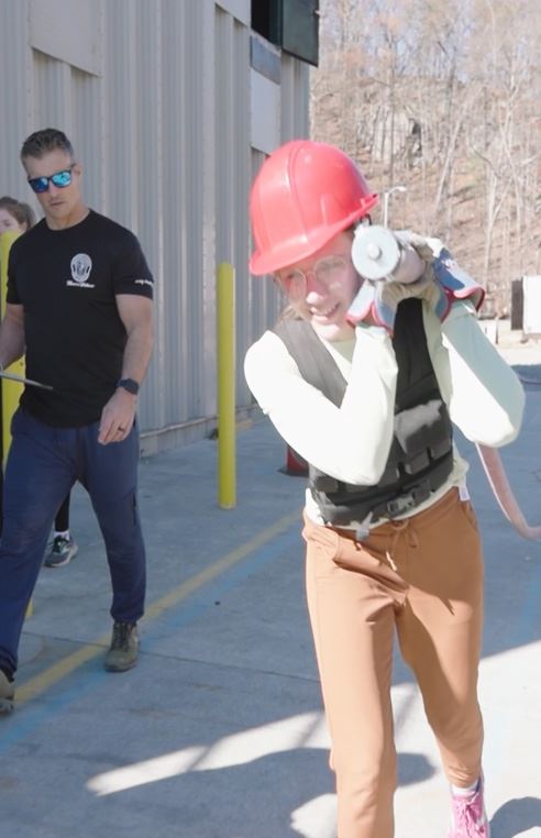 We’re Roaming Roanoke County at the Fire and Rescue Academy. Laura Schneider, the Community Outreach Coordinator for Fire and Rescue, and Em Poertner try their hand at the physical agility test that recruits have to complete as part of their application.